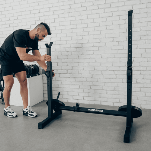- Ascend Squat Rack with metal bar holders for bench pressing