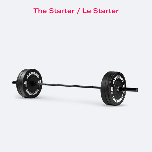 - The Starter: Olympic Barbell (7 ft) + Bumper Plates (2 x 10 lbs, 2 x 25 lbs, 2 x 45 lbs)